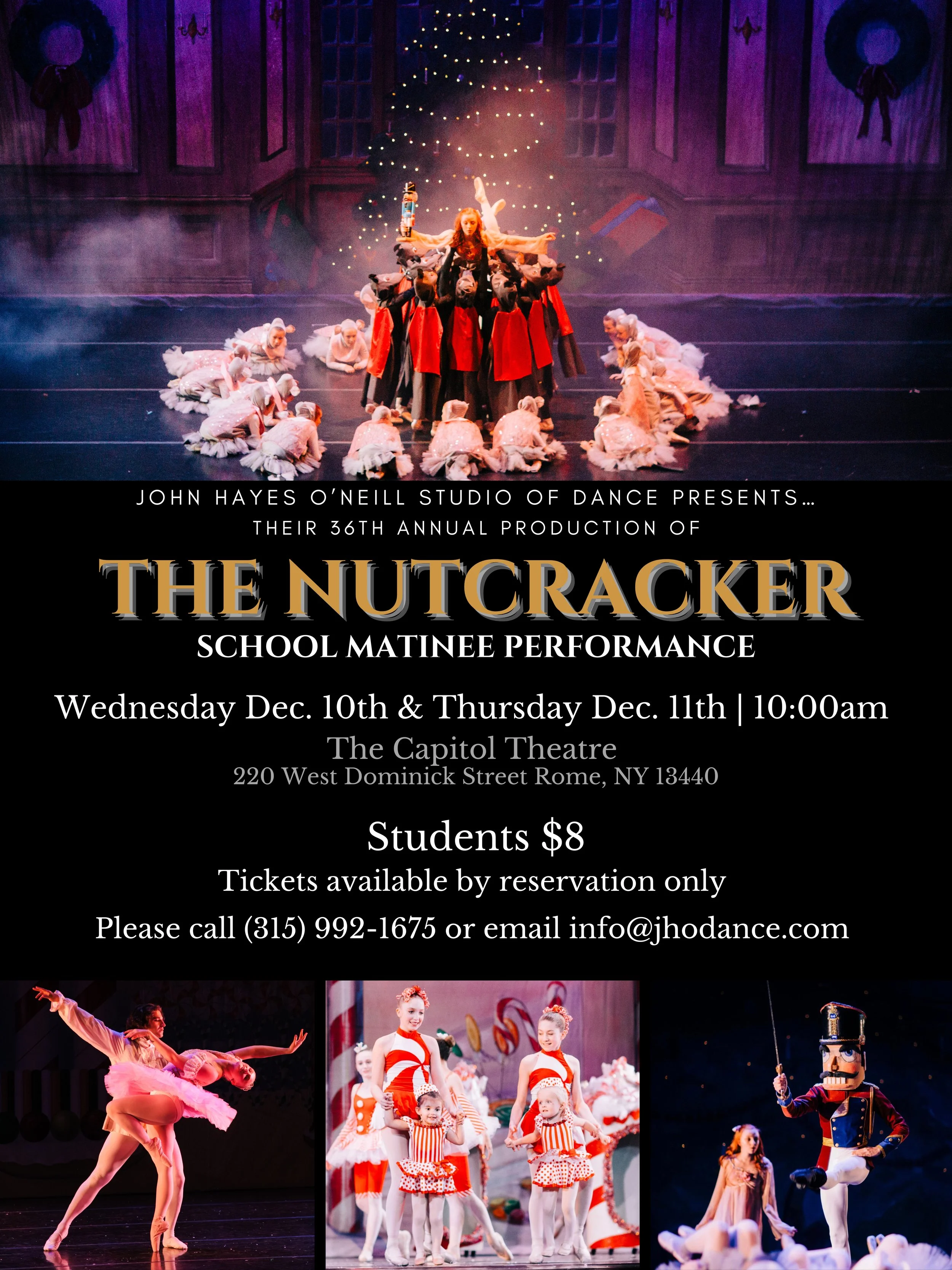 As part of our ongoing commitment of making dance available to children and students, we are offering two school Matinees at the Capitol Theatre in Rome, New York on Wednesday and Thursday December 10th & 11th 2025 at 10:00 am. Admission is $8.00 per student. We are also listed on the roster of artists for the Regional Arts-In-Education Services with MOBOCES. If you wish to make your reservation through “AIE MOBOCES” please contact Cheri Schmalz at CSchmalz@moboces.org.RESERVE YOUR SCHOOL TODAY